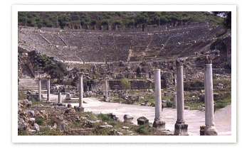 8. The image of Artemis at EphesusThe story is told in the Acts of the Apostles 19.35, when Saint Paul visited Ephesus (around the years 52-54 C.E.), a certain Demetrios, a local silversmith who made his business out of selling silver images of the Temple of Artemis, roused the citizens against him, so that a riot erupted. The people flocked to the theater shouting "great is Artemis of the Ephesians!" but they were quieted by the city's secretary, who is quoted as saying "Who does not know that Ephesus is neokoros (temple-warden; see that heading) of the great goddess Artemis and of the heaven-fallen (statue of her)?" The goddess Artemis was Ephesus' most potent patron and symbol ( 15 , 38 ). The Ephesians even claimed that the goddess had been born not far away, at a site called Ortygia, and showed off on their coins ( 19 ) the palm tree that her mother Leto had clung to while giving birth (though the residents of Delos contested this, with their own palm tree in a sanctuary of Apollo, Artemis' twin brother). ![]() The theatre. The patron god of Ephesus was identified with the Hellenic Artemis, called Diana by the Romans. She was most often shown as a huntress on Ephesian coins ( 35 ), though occasionally in other aspects (or identified with the goddess Hecate as Phosphoros, "bringer of light,"). But the goddess of Ephesus was originally a deity native to Anatolia, where the gods appeared differently from those of Greek mythology. Her sacred image is a stiff figure ( 22 , 27 , 36 ), wrapped closely in elaborate garments, adorned with decorative animal protomes ( 15 ), and wearing massive necklaces and pectorals that came to be interpreted as multiple breasts. Excavations on the site of her temple at Ephesus have revealed parts of ivory images of her, along with the bronze belts and bulbous amber pendants that may have decorated her. This Artemis was Ephesus' protectress, so on her tall crown she sometimes wears the walls and temples of the city itself sacred woolen fillets fall from either hand ( 38 ), though they sometimes look like supports, while at her sides stand two deer, her particular animal ( 15 ). Coins show her standing in her temple, which was one of the largest structures ever built by the Greeks, acclaimed as one of the Seven Wonders of the World, and the model for Demetrios' little silver souvenirs. Even the Roman emperors paid homage to her ( 31 ). One interesting coin ( 32 ) shows what may be a divination ritual taking place before the image of Artemis: two naked boys are throwing knucklebones, i.e., animal vertibrae used by the ancients for gambling (as if they were dice) or in sanctuaries like this one, for prophecy (Scholia to Pindar, Pythian 4.338; a and b). One of the early excavators of the temple of Artemis at Ephesus, D. G. Hogarth, found many such knucklebones in the earliest levels; there were both natural bones and ivory imitations, many strung for suspension, and some studded with gold or amber decorations. It is interesting to compare the representations of Ephesian Artemis with those of Artemis Leukophyrene, whose cult was centered at Magnesia ad Maeandrum ( 41 ). The representation of the two cult statues was very similar, but Leukophyrene had geese in place of the Ephesian deity’s deer, and is often flanked by crowning Nikes. |